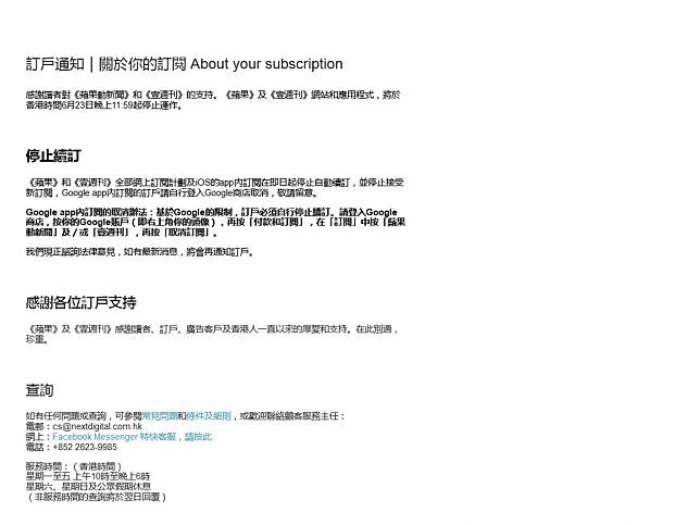 蘋果日報 網站及部分社交媒體停止運作